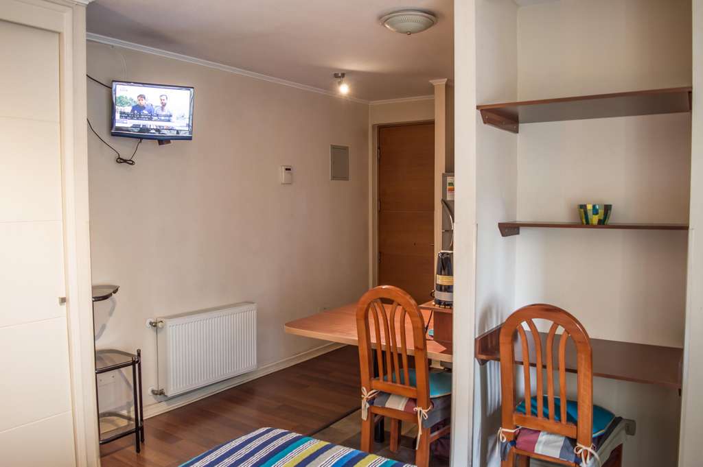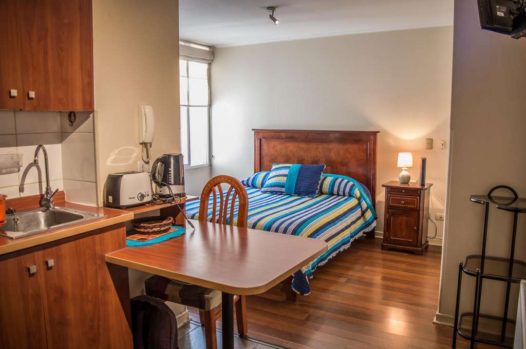 Departamento amoblado de un ambiente (studio) ubicado a 2 minutos caminando de la parada de autobús y a 5 minutos caminando de la Estación de Metro Santa Ana.El departamento tiene living, comedor, cocina (abierta) y 1 baño. La habitación 1 tiene cama matrimonial, clóset, 2 sillas y baño en suite; El lugar mide 22m² aproximadamente. Los gastos de servicios de gastos comunes, agua caliente, agua fría y electricidad se pagan por adelantado junto a la renta mensual, con un límite de consumo de $ 109USD. El alojamiento tiene lavandería compartida cuyo valor es $ 1USD aproximadamente por carga de ropa (lavado o secado). Se debe pagar garantía (depósito) la que será devuelta al finalizar el período de arriendo; además, se debe pagar $ 55USD al momento de devolver el alojamiento para realizar la limpieza del lugar. Cerca del alojamiento se encuentra los emblemáticos liceo 1 Javiera Carrera y Liceo Aplicación, además de la iglesia Parroquial de Santa Ana, monumento nacional. A pasos podrás encontrar la plaza de Armas de Santiago, parte importante del casco histórico de Santiago, reconocido por su arquitectura e infraestructuras, tales como el Correo de Santiago, Catedral de Santiago, Municipalidad y la Casa Colorada.